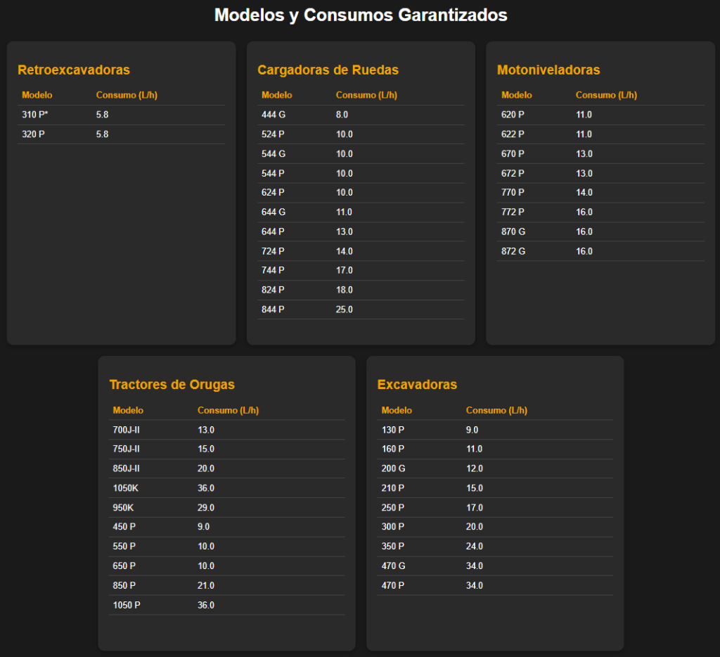 - Excavadoras: 130 P, 160 P, 200 G, 210 P, 210 G, 250 P, 300 P.